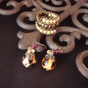 ゴールドとの螺旋編みが大人っぽくてカッコイイ!一周全てチェコガラスで編んでいる為、横から見ても華やかで、人差し指につけるのがお薦め。もちろん他の指でもOKです。ピアスはインパクトのあるヒョウ柄でお洋服やさんのスタッフなどおしゃれな方に人気があります!!(チェコガラス他)