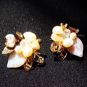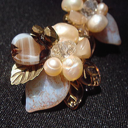 ブラウン×ピンクの優しい色あわせがステキなシャワー台のイヤリングは迫力抜群!!いろいろな素材のリーフのパーツで動きを出しています。真ん中にある水晶はカットが入っているのでキラキラ感もあり、お顔を明るく見せてくれますよ★