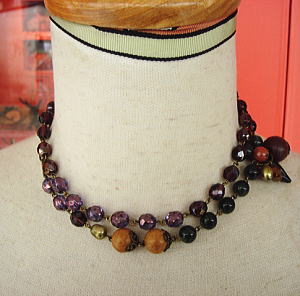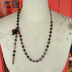 ブロンズがかったパープルのチェコガラスに深みのアルグリーンの天然石(カルセドニー)と淡水パール、今流行のウッドパーツを合わせたネックレス。