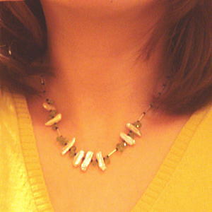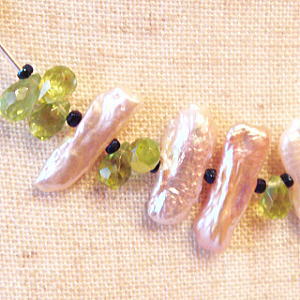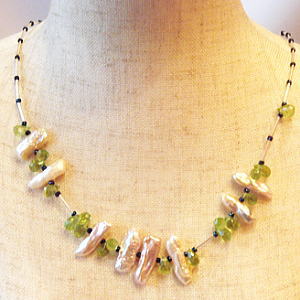 雫型のペリドットと淡水パールをパーツを計算されたバランスのとれた位置に配置し出来上がったネックレス☆