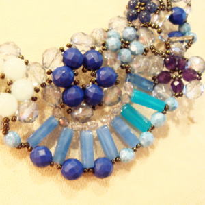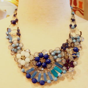 濃淡のブルーのパーツで大ぶりに編んだネックレスは1点もの!!