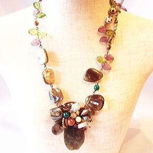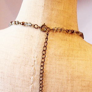動きの出るチェコ製のガラスリーフやスモーキークオーツなどを使用し出来上がったこちらのネックレスはカジュアルなお洋服に合わせたい方におススメです!!