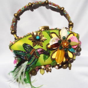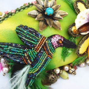 トロピカルなカラー、今にも飛んでいきそうな鳥の姿に心引かれる一品。歩くたびしっぽの羽がゆらゆらとゆれ女性らしさを演出♪