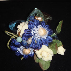 ベルベットのお花とブルーの天然石ソーダライトと淡水パールを合わせたコサージュ。洋服に着けるだけでなくバックにつけてもおしゃれです!!